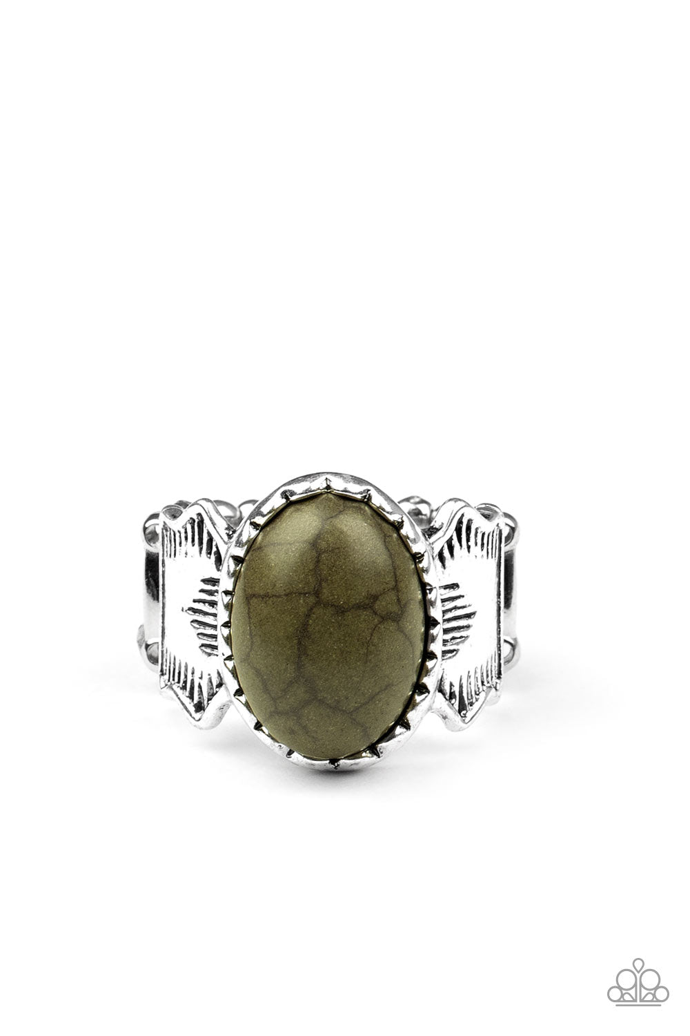 An oval Military Olive stone is pressed into the center of a zigzagging silver frame etched in antiqued linear patterns for a tribal flair. Features a stretchy band for a flexible fit.