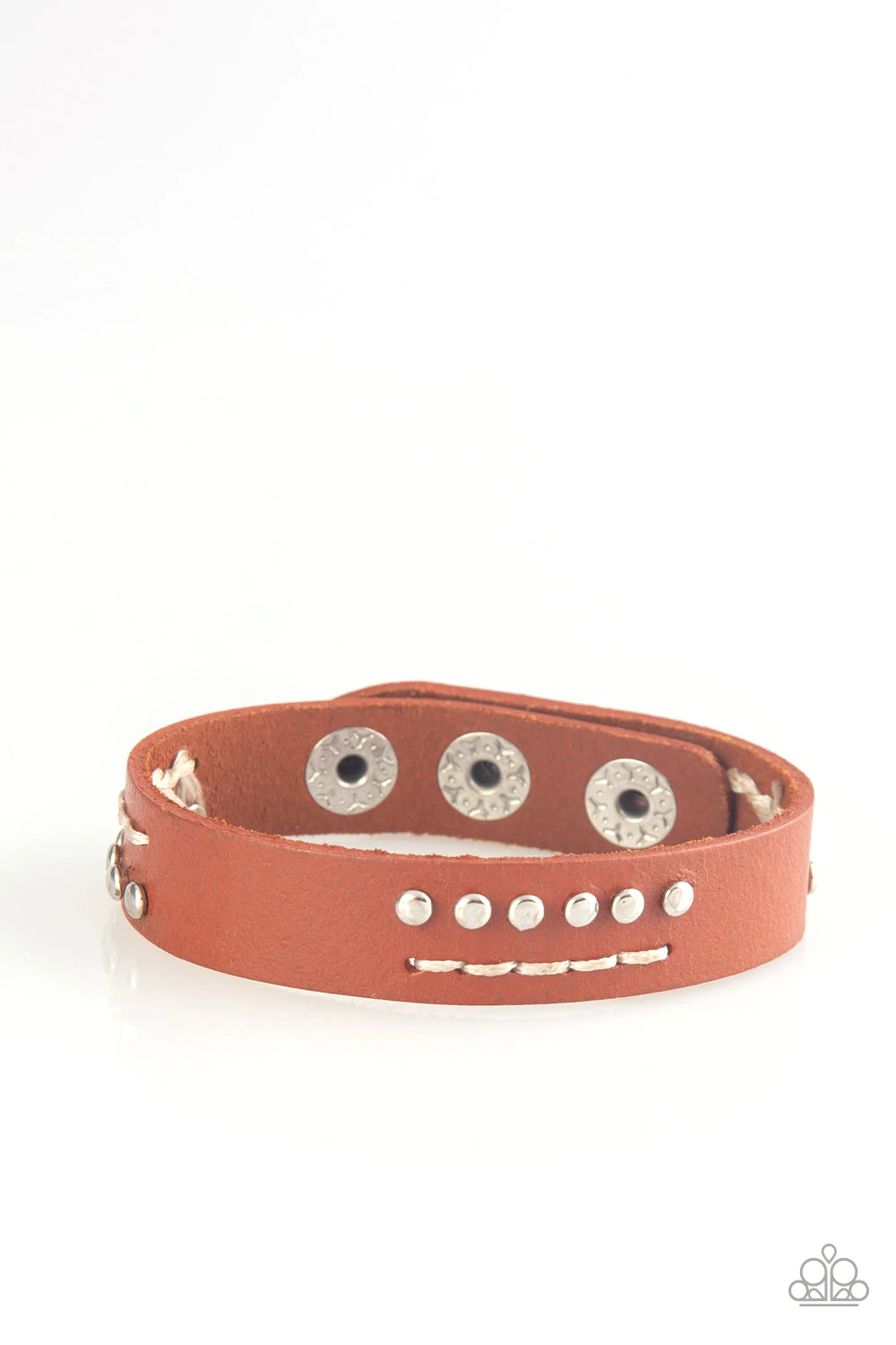 Sections of shimmery silver studs and stitched white thread adorns the front of a brown leather band for an adventurous look. Features an adjustable snap closure.