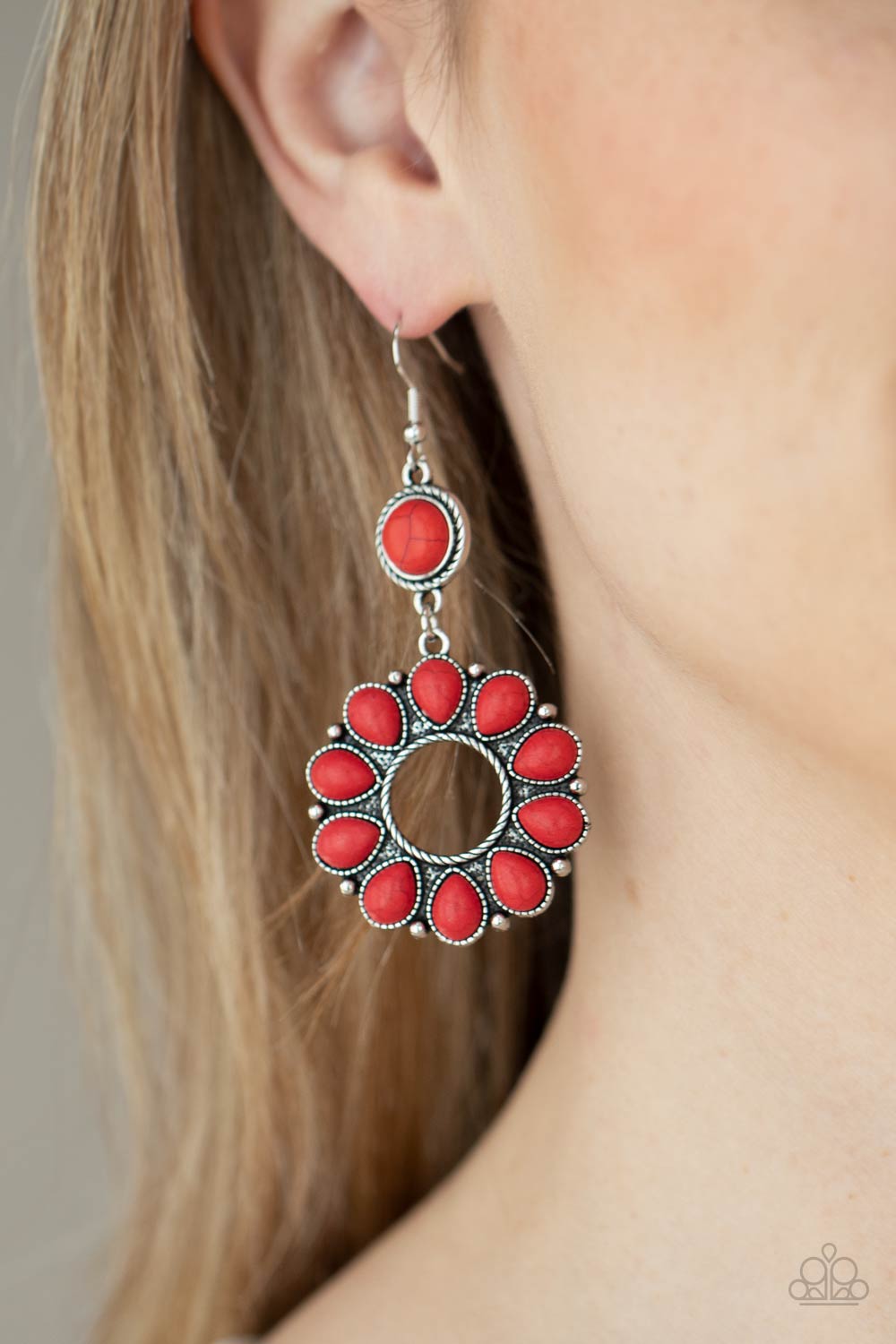 A fiery collection of red teardrop stones fan out from a textured silver ring, creating a scalloped floral frame at the bottom of a round red stone dotted frame. Earring attaches to a standard fishhook fitting.