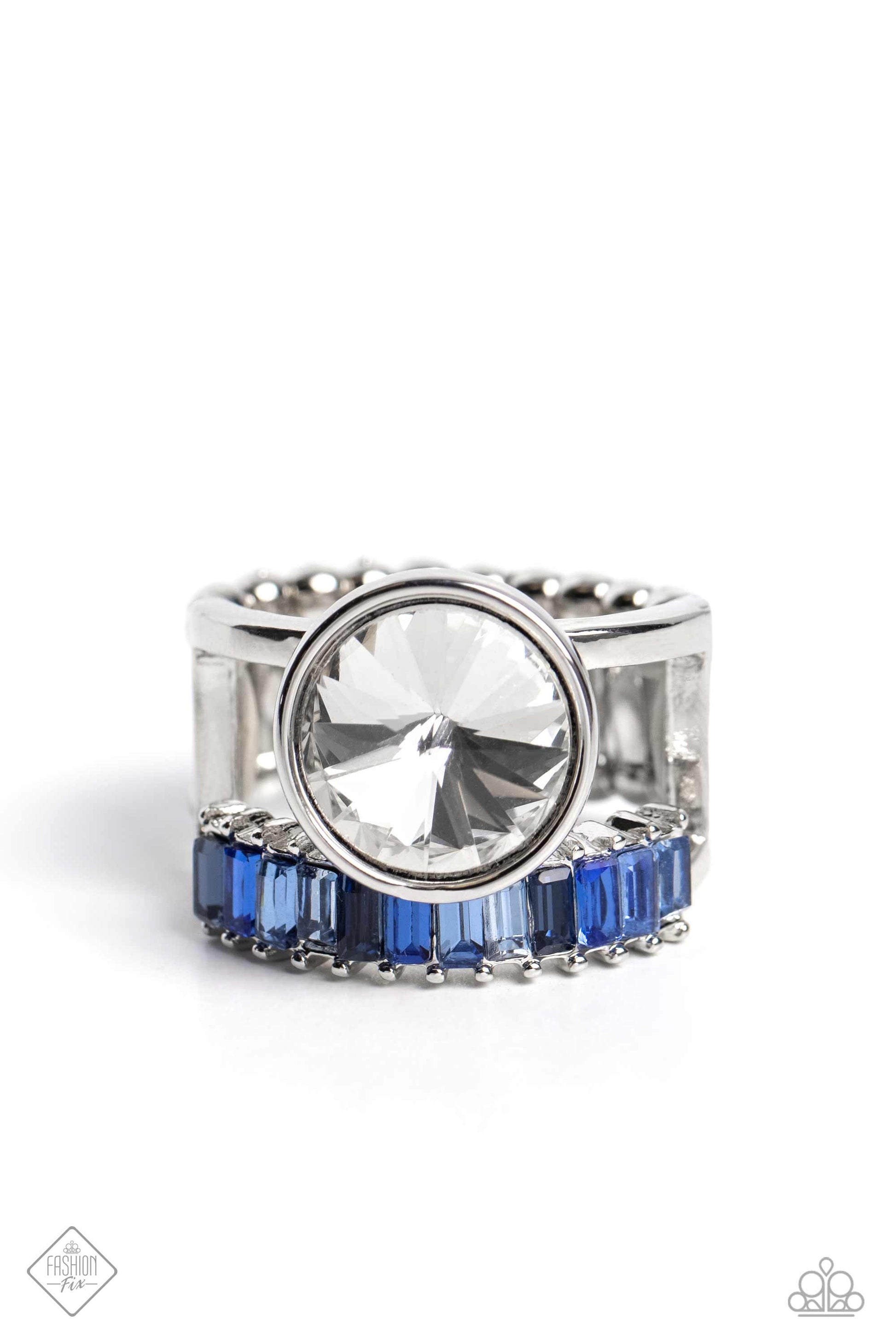 A row of glitzy, emerald-cut, blue rhinestones flares out from the bottom of an airy silver frame, while an oversized classic white gem crowns the top of the design, creating a smoldering statement piece atop the finger. Features a stretchy band for a flexible fit.