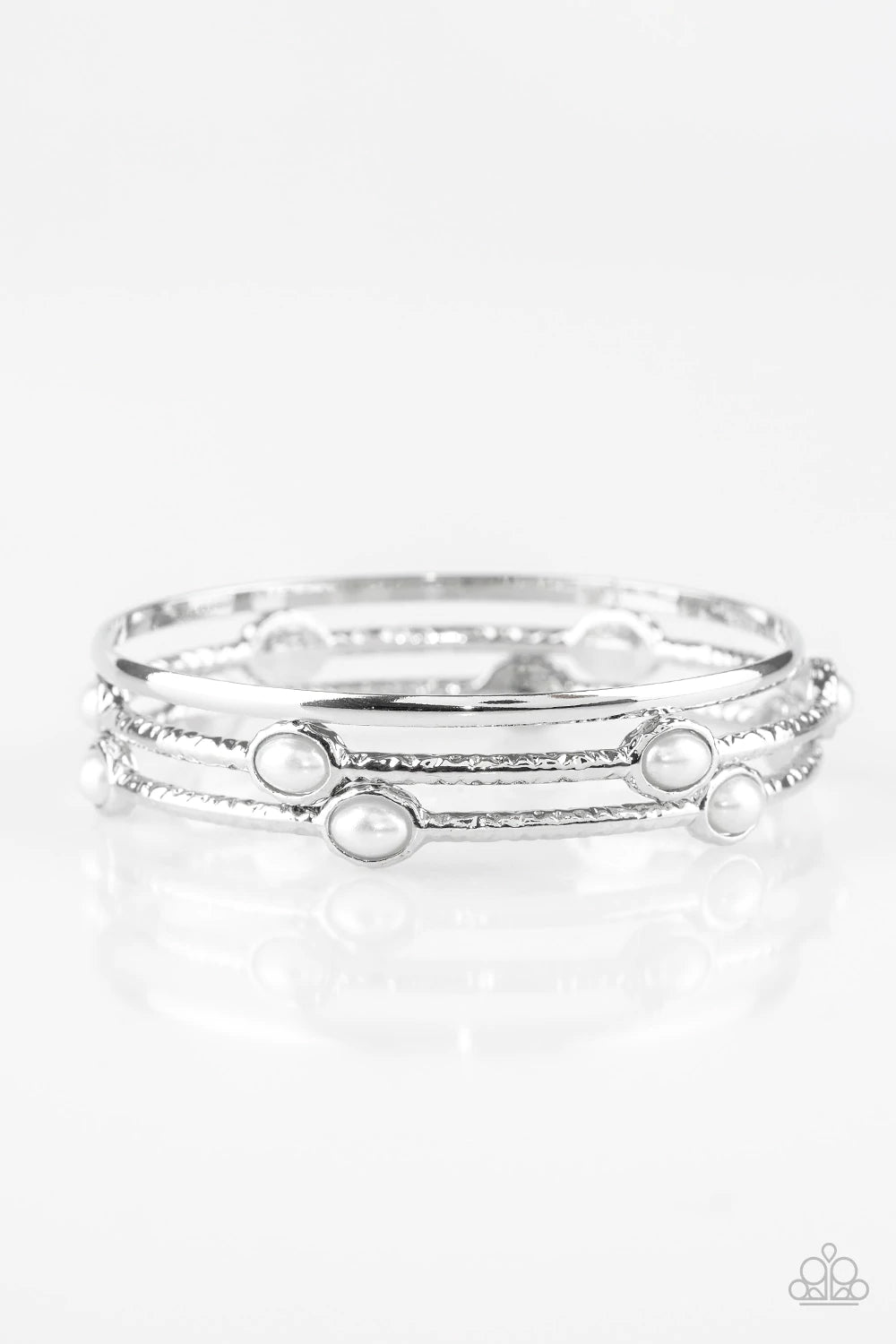 Delicately hammered in shimmer, a pair of pearly white encrusted bangles joins a smooth silver bangle around the wrist for a refined fashion.