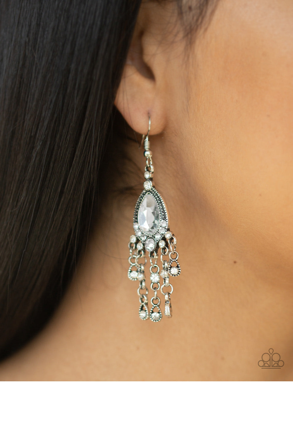 Dotted with dainty white rhinestones, silver teardrop frames cascade from the bottom of an oversized white teardrop gem encrusted frame, creating a timeless chandelier. Earring attaches to a standard fishhook fitting.