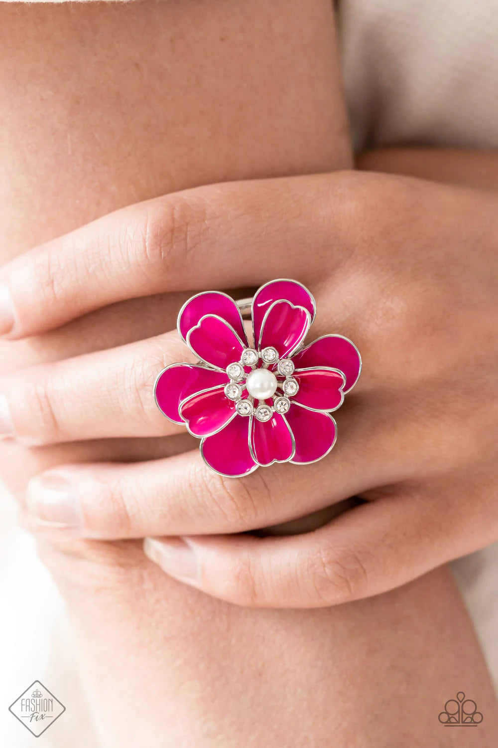 An exaggerated pink flower with layers of petals blooms atop the finger in a vibrant display. A white pearl encircled by tiny white rhinestones adds a touch of whimsical sparkle to the design. Features a stretchy band for a flexible fit.