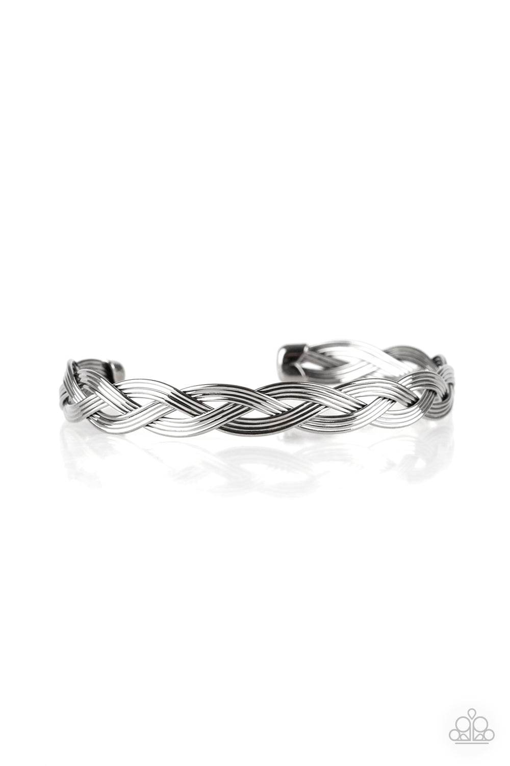 Glistening gunmetal wires braid across the wrist, coalescing into a dainty cuff.