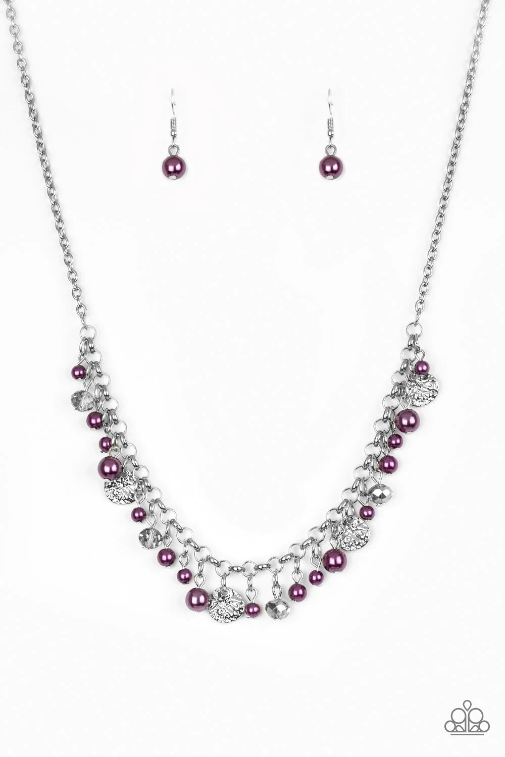Pearly purple beads, smoky crystal-like gems, and hammered silver discs swing from a bold silver chain, creating a refined fringe below the collar. Features an adjustable clasp closure.