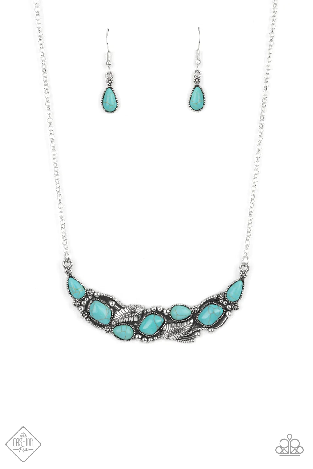 A collection of asymmetrical turquoise stones adorns the front of a studded silver frame embossed in floral and feathery accents. The pendant sits boldly below the collar, creating a seasonal centerpiece. Features an adjustable clasp closure.