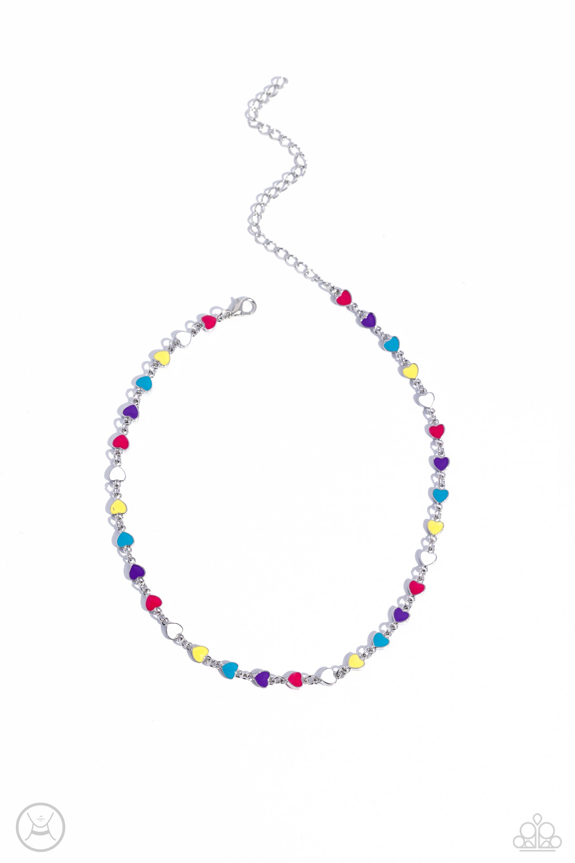 Multicolored-painted silver hearts interconnect around the collar for a simply sentimental look. Features an adjustable clasp closure.