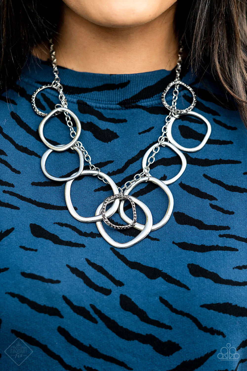 Oversized asymmetrical silver rings swing from the bottom of a glistening silver chain. Matching silver rings, encrusted in hematite rhinestones, trickle between the dizzying fringe adding sparkly smolder to the edgy display. Features an adjustable clasp closure.