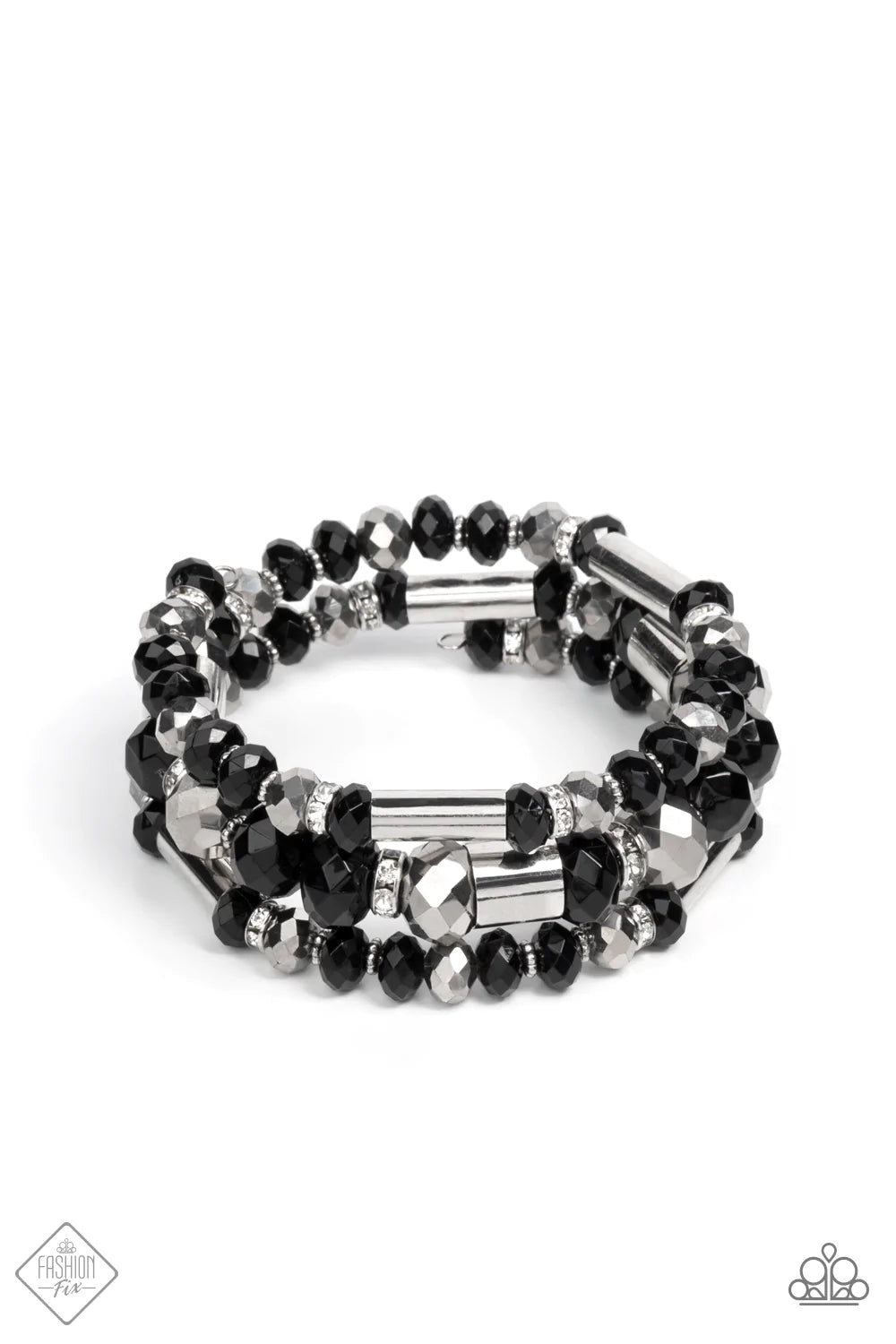Stacks of black and silver faceted beads, interspersed with silver cylindrical accents and rhinestone-encrusted beads, are threaded along an infinity wrap-style bracelet making an intensely dynamic statement around the wrist.