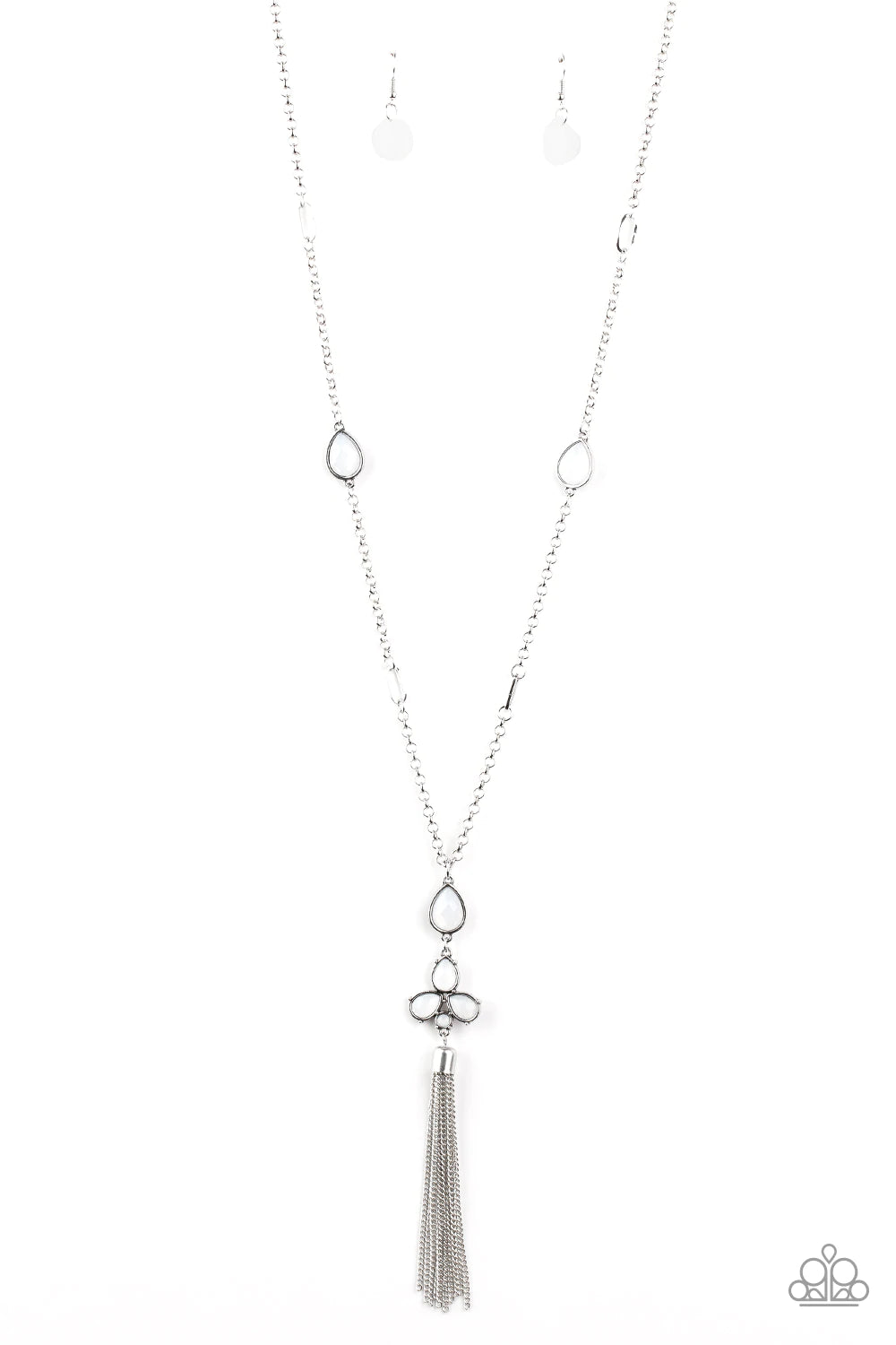 A cluster of dewy white teardrop beads coalesces at the bottom of a lengthened silver chain. Matching beads embedded in airy silver frames dot the chains that climb the chest, bringing an extra pop of color to the whimsical design. A glistening silver tassel cascades from the bottom of the colorful pendant, creating ethereal movement. Features an adjustable clasp closure.