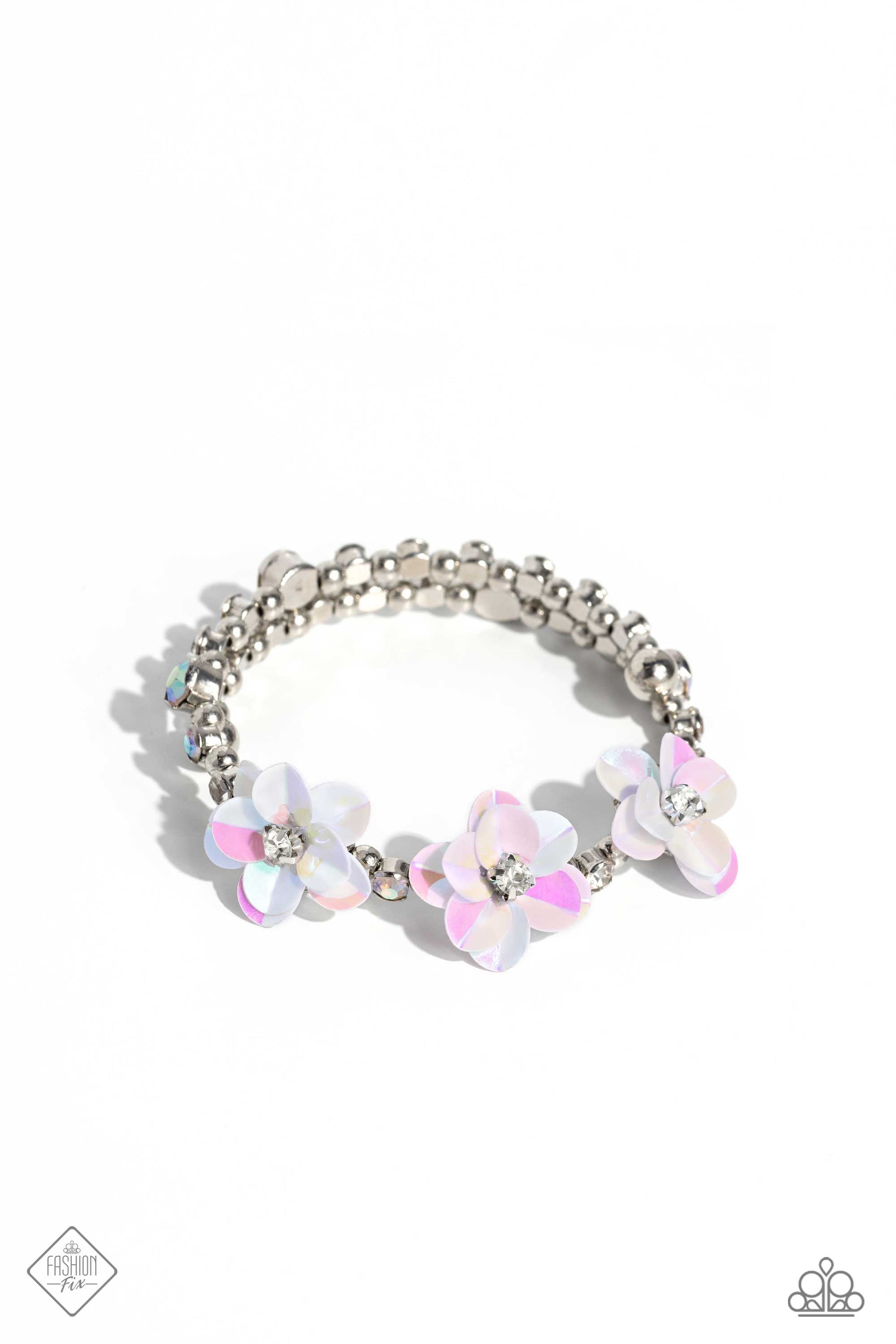 Shiny silver beads, white rhinestones in sleek silver frames, and varying sizes of iridescent gems in the same silver frames are threaded along a wire that coils around the wrist to create an infinity wrap style bracelet. At the center of the design, a trio of white iridescent flowers with white rhinestone centers emerges, adding a touch of whimsical color and three-dimensional texture. Due to its prismatic palette, color may vary.