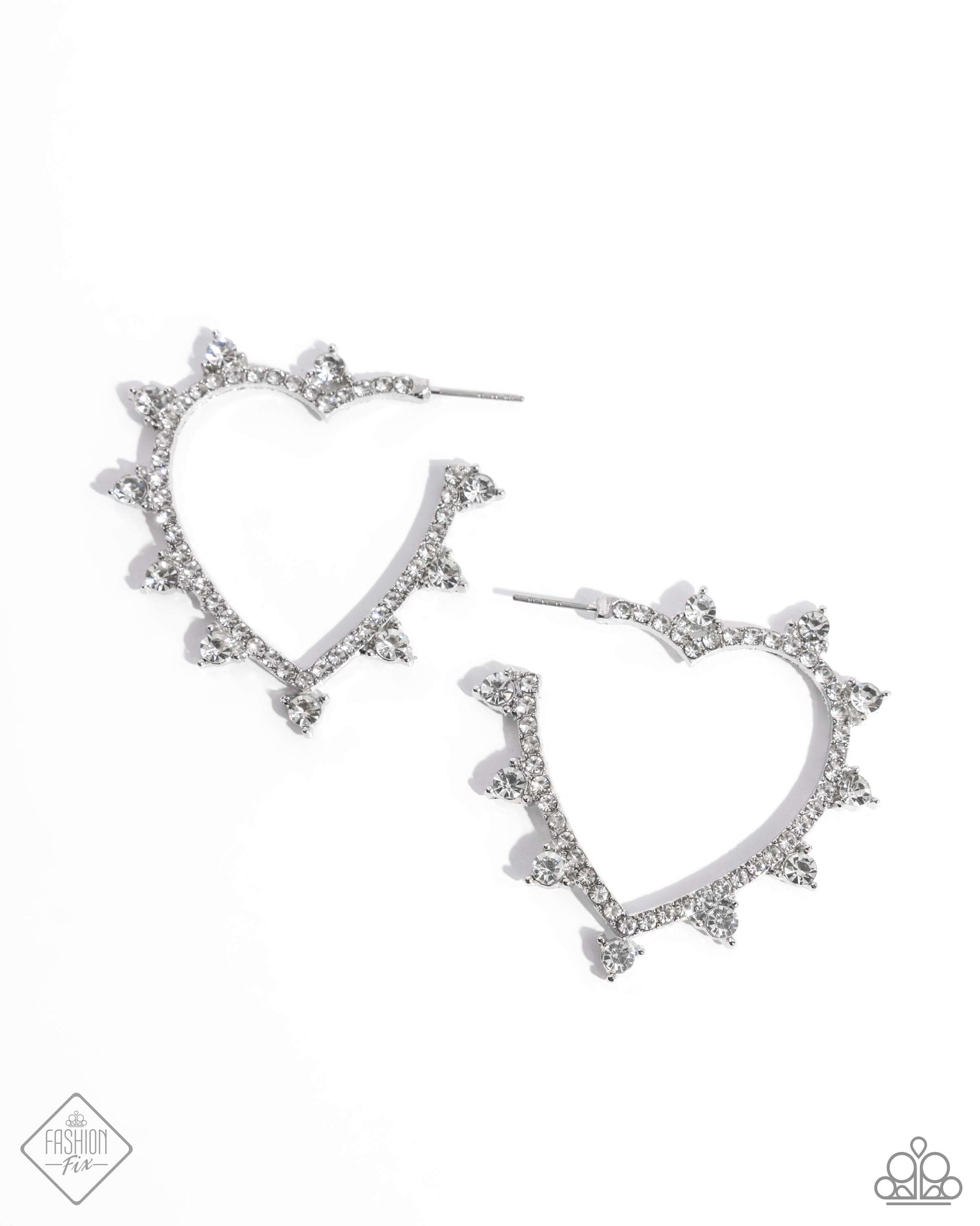 Embellished along the curvature of a silver heart hoop, dainty white rhinestones glitter along the ear. Elevated round rhinestones dot along the outer curve of the heart for additional shimmer. The faceted surfaces of each rhinestone catch and reflect light from every angle, resulting in a timeless, twinkling statement piece. Earring attaches to a standard post fitting. Hoop measures approximately 1 1/2" in diameter.