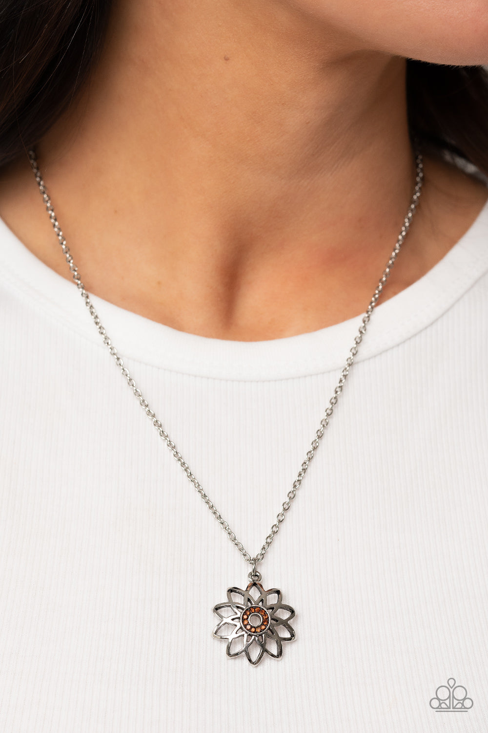 Beveled silver frames fan out from a dainty ring of glitzy topaz rhinestones, blooming into an airy floral pendant at the bottom of a dainty silver chain. Features an adjustable clasp closure.