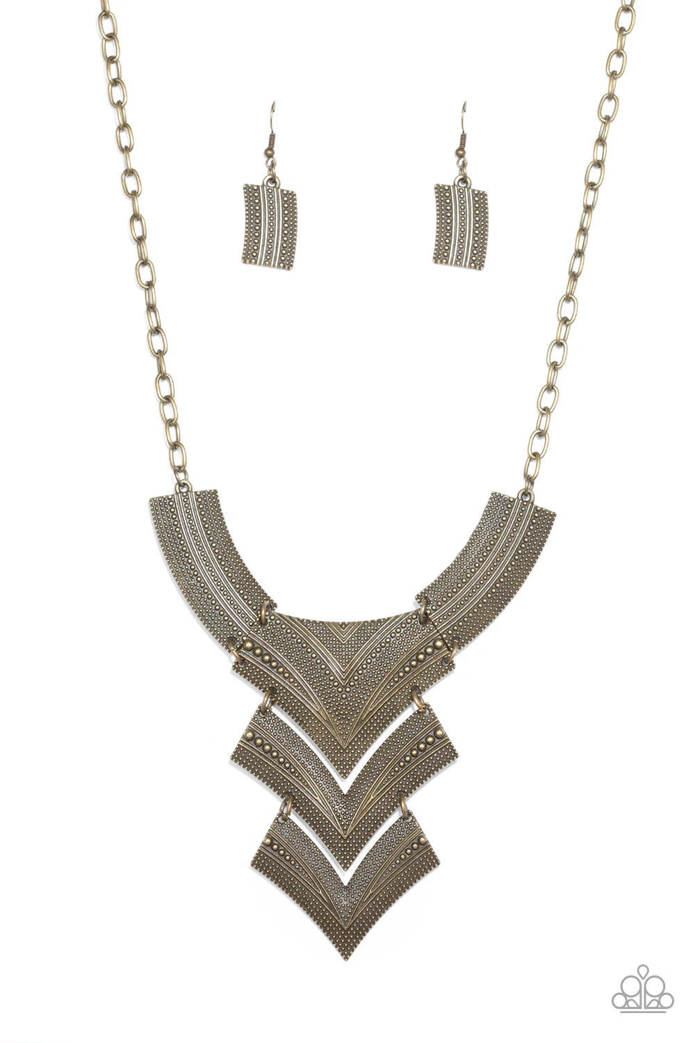 Radiating in studded details, antiqued brass plates link below the collar, joining into a fierce geometric pendant. Features an adjustable clasp closure.