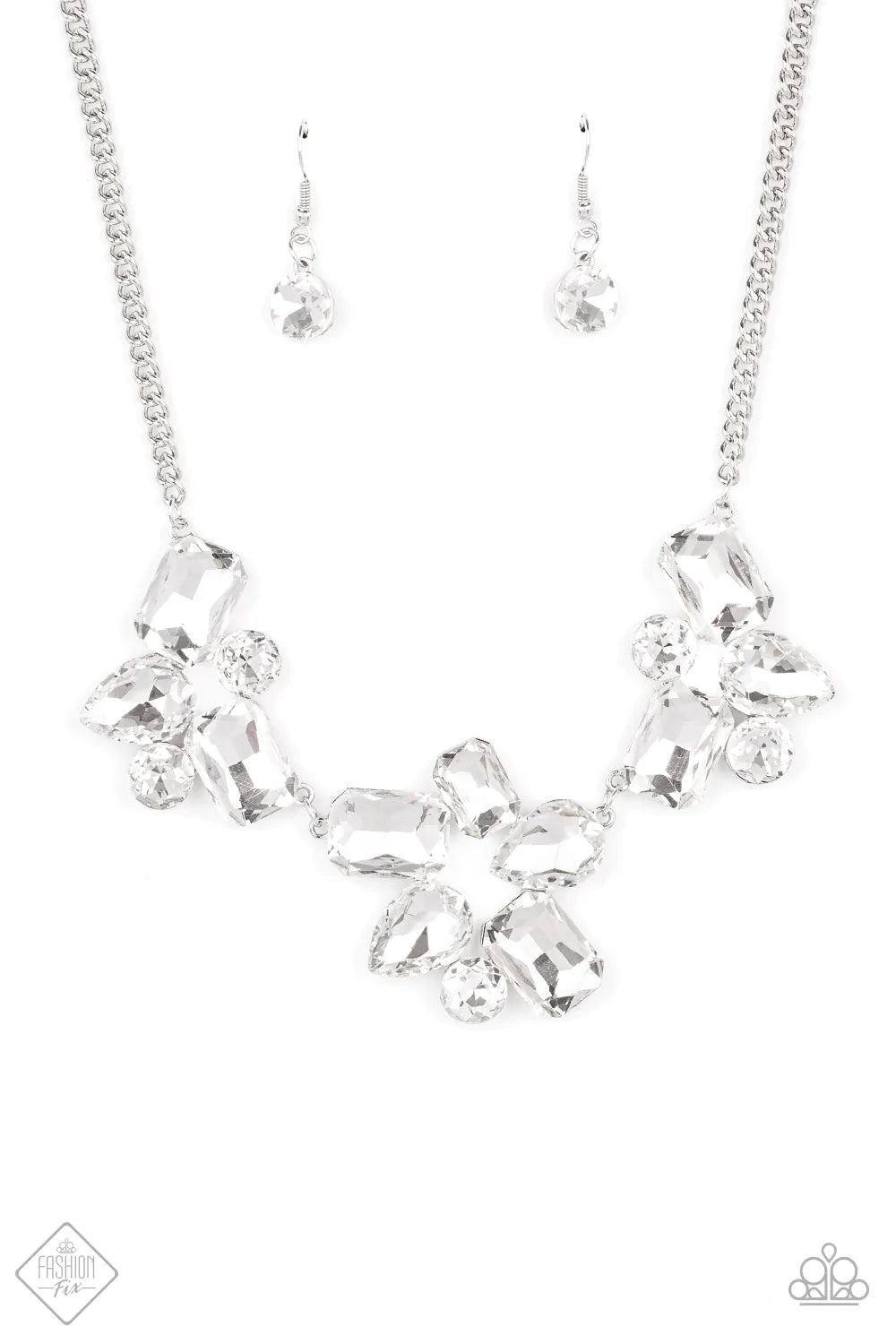 An unexpected explosion of oversized round, teardrop, and emerald cut rhinestones cluster into haphazard groupings. The blinding clusters link together, creating a stellar statement piece that sits below the collar. Features an adjustable clasp closure.