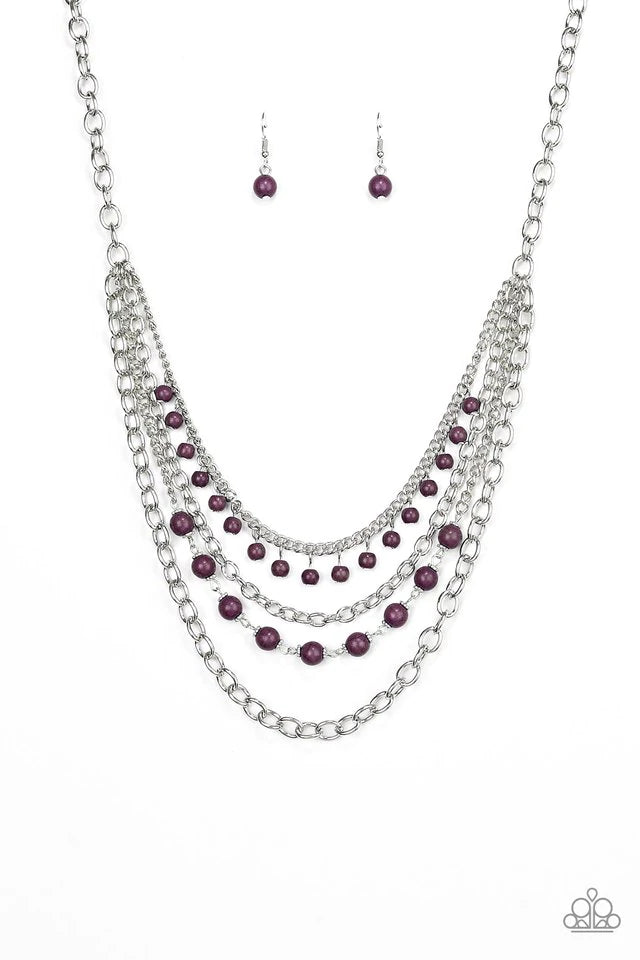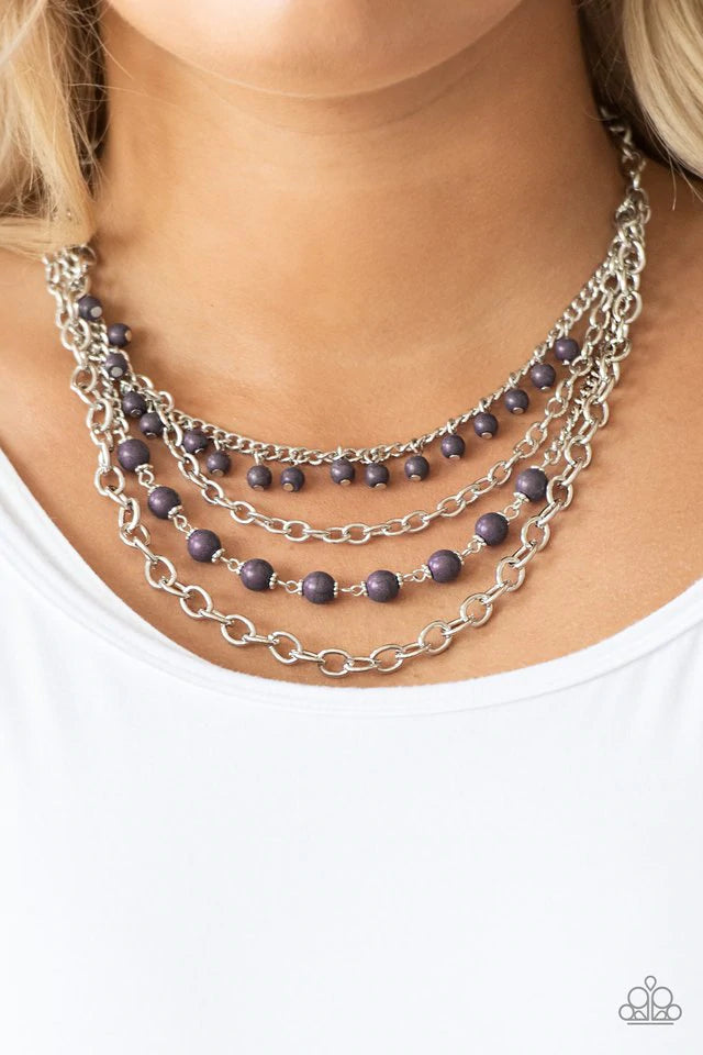 Featuring vivacious purple stone accents, mismatched silver chains layer below the collar for a seasonal look. Features an adjustable clasp closure.
