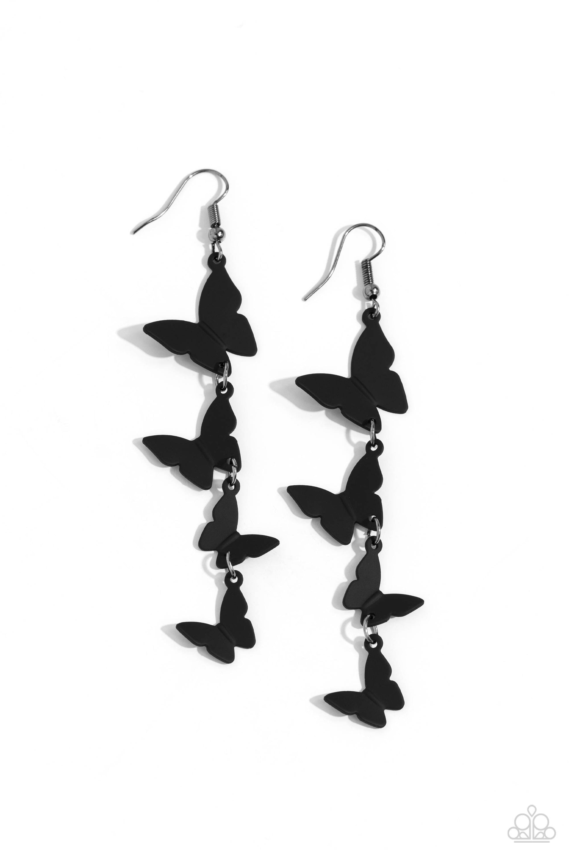 A collection of black butterflies fall from the ear in an alternating, haphazard pattern, slowly decreasing in size, culminating in a whimsical lure. Earring attaches to a standard fishhook fitting.