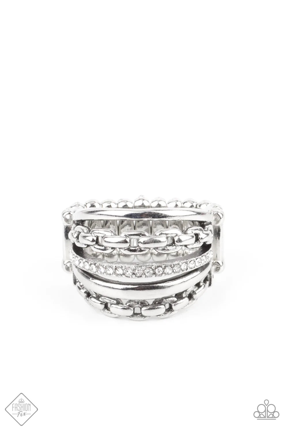 Infused with a dainty band of glassy white rhinestones, antiqued silver bands and layers of mismatched silver chains layer across the finger in a bold finish. Features a stretchy band for a flexible fit.
