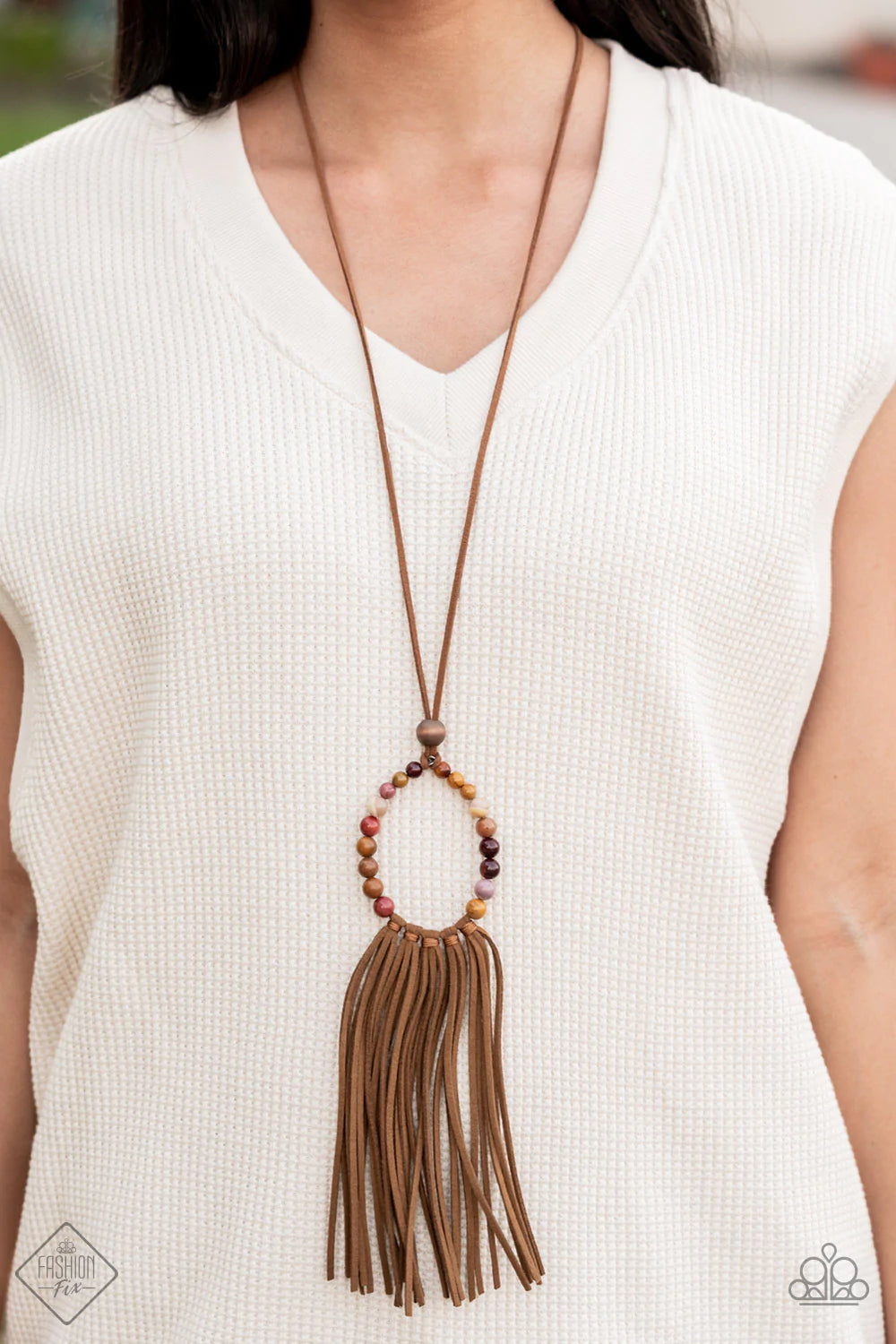 A collection of earthy multicolored stone beads are threaded around a wire hoop that is fastened at the end of a lengthened brown suede cord. The earthy stones make way for a foxy fringe of brown suede that sways from the bottom of the hoop, resulting in a rustic down-to-earth vibe. Features an adjustable clasp closure.