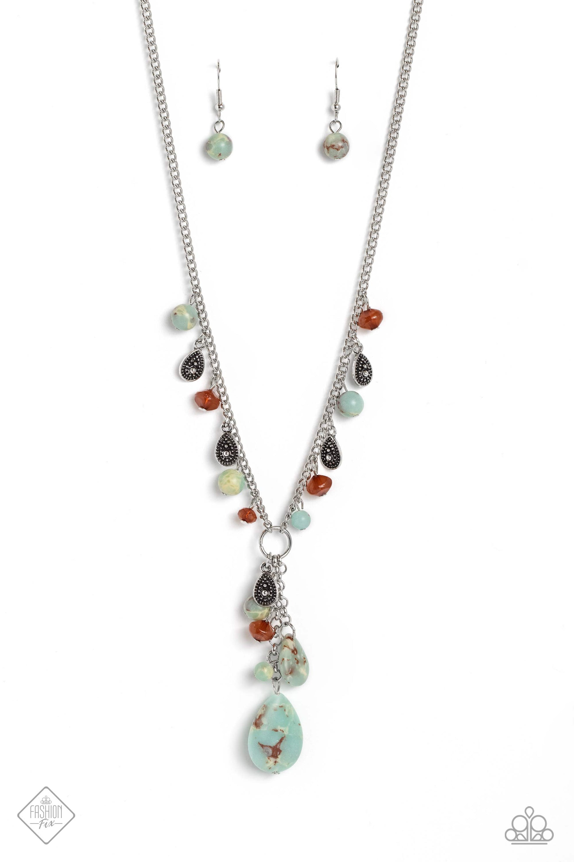 Earthy, blue, marbled stones join glassy brown beads, studded silver teardrops along an elongated silver chain below the collar. Featuring a marbled effect, an oversized blue teardrop stone pendant swings from the center of the earthy display for a statement-making finish. Features an adjustable clasp closure. As the stone elements in this piece are natural, some color variation is normal.