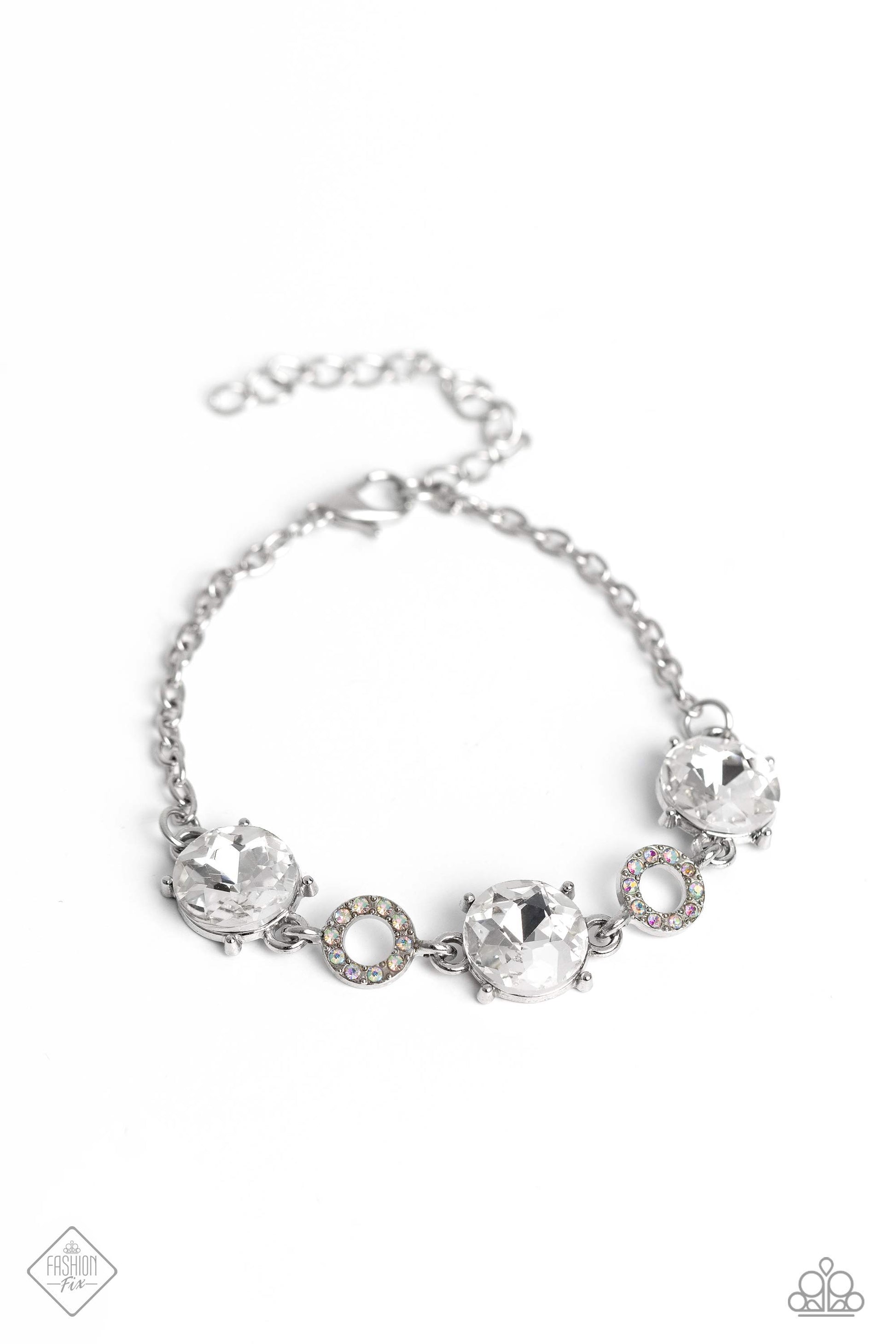 A collection of dramatically pronged and highly reflective white gems alternate with silver rings embossed in iridescent rhinestones, emphasizing the sheen from each element as they link around the wrist. Due to its prismatic palette, color may vary.