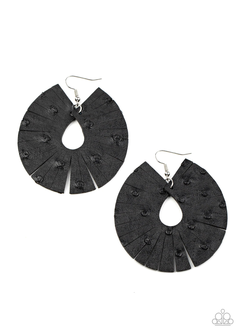 Dotted in distressed textures, a black leather teardrop is spliced into a trendy fringe-like pattern. Earring attaches to a standard fishhook fitting.