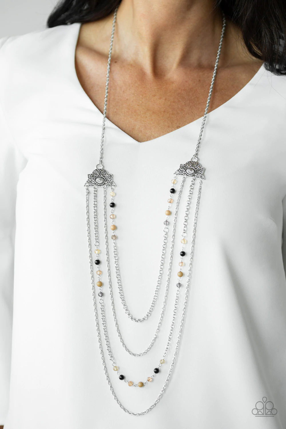 Attached to two ornate floral silver fittings, shimmery silver chains and strands of polished brown, black, and glassy crystal-like beads cascade across the chest for a whimsically layered look. Features an adjustable clasp closure.