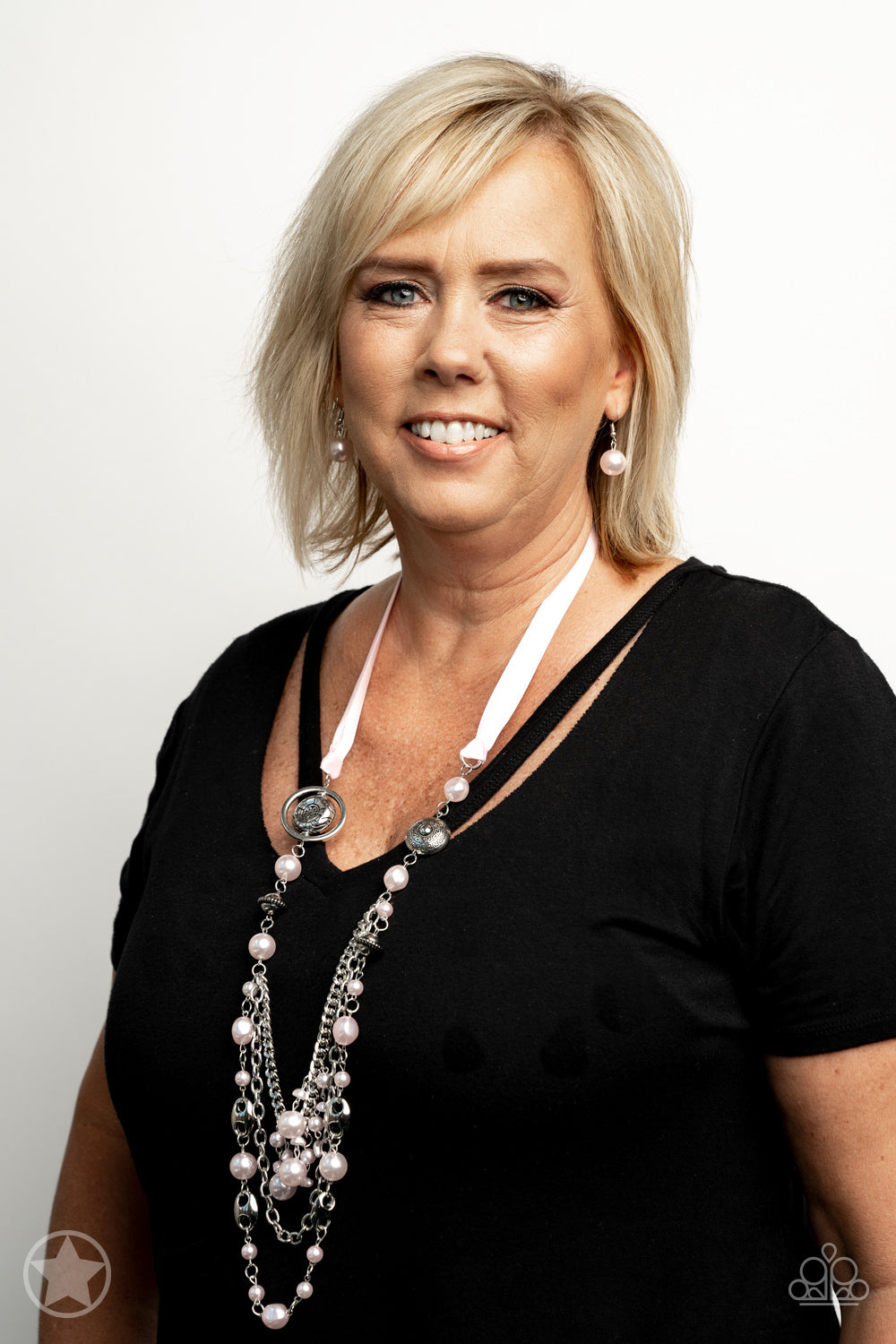 A silky pink ribbon replaces a traditional chain to give an elegant look. Pearly pastel pink beads and funky silver pieces intermix with varying lengths of silver chains to give a fresh take on a Victorian-inspired piece.