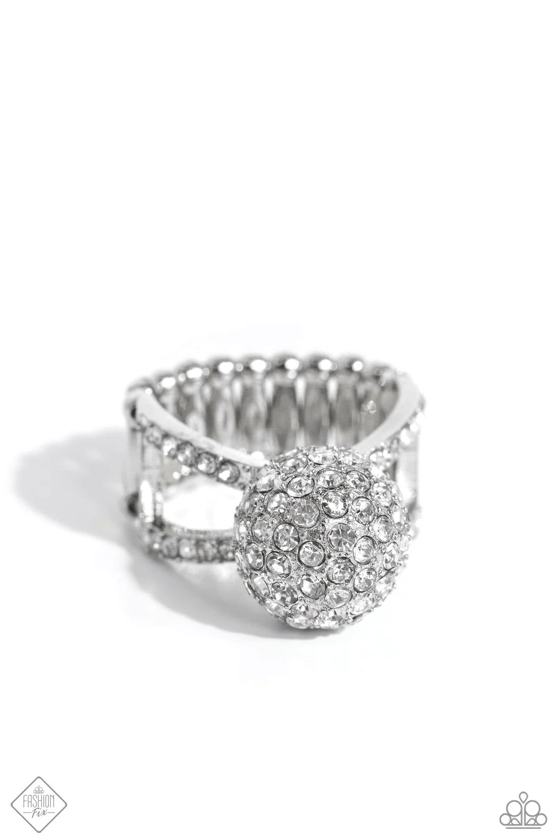 Dotted in dainty white rhinestones, blinding silver frames delicately crisscross across the finger for a dramatic sparkle. Featured in the center of the sparkly, airy bands, an elevated rhinestone-encrusted silver ornament creates a blinding statement atop the finger. Features a stretchy band for a flexible fit.