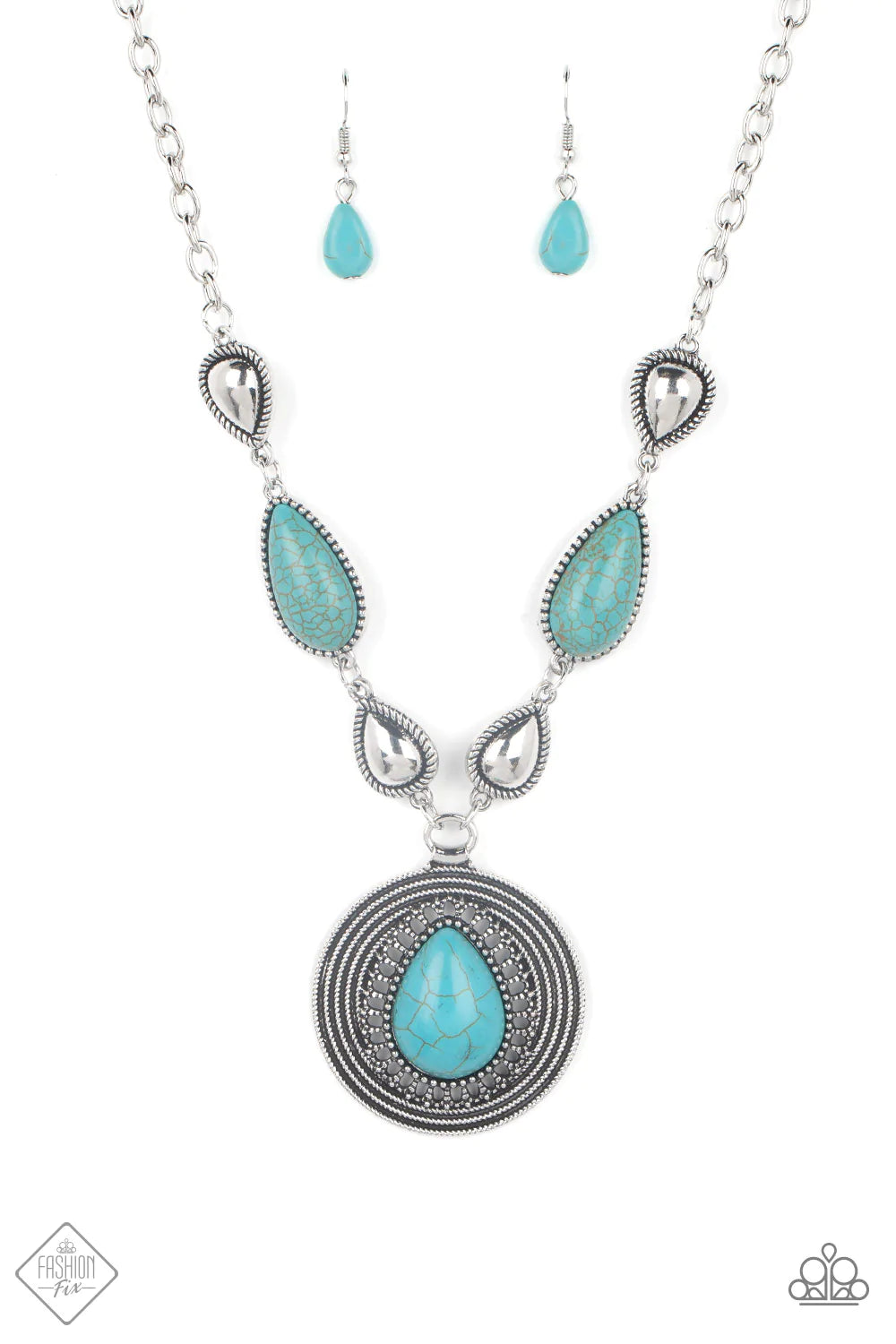 An array of silver and turquoise teardrops give way to a rustic pendant composed of an earthy turquoise stone wrapped in a studded filigree frame. Layers of studded texture encircle the refreshing stone, creating a dramatic artisanal display below the collar. Features an adjustable clasp closure.