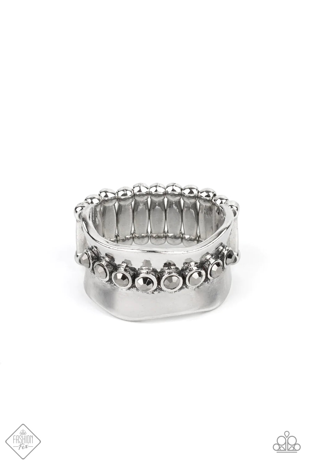 A smoky row of dainty hematite rhinestones juts from the center of a wavy silver band, creating an edgy centerpiece atop the finger. Features a stretchy band for a flexible fit.