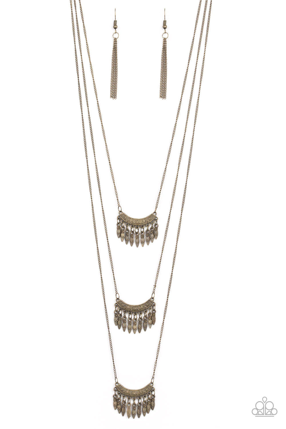 Infused with beaded brass fringes, floral embossed brass frames layer down the chest in a whimsically stacked fashion. Features an adjustable clasp closure.