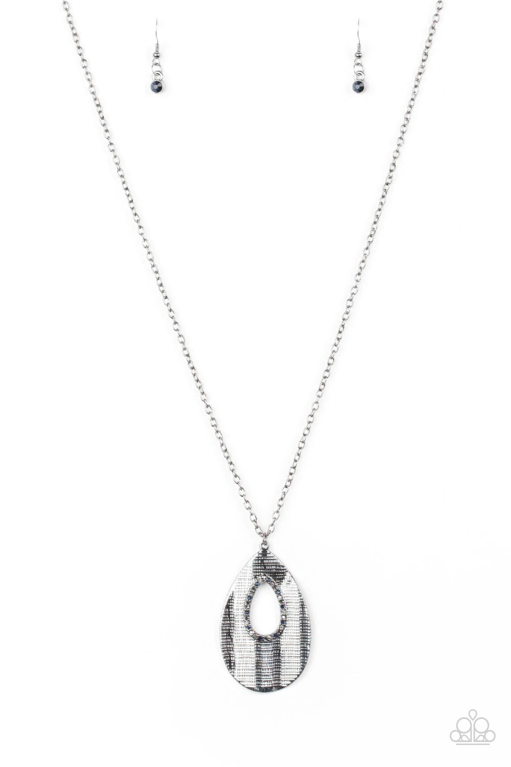 Embossed in a linear geometric pattern, a warped gunmetal teardrop swings from the bottom of a lengthened gunmetal chain. Glittery blue, hematite, and smoky rhinestones are encrusted around the center of the teardrop pendant for a sparkling finish. Features an adjustable clasp closure.