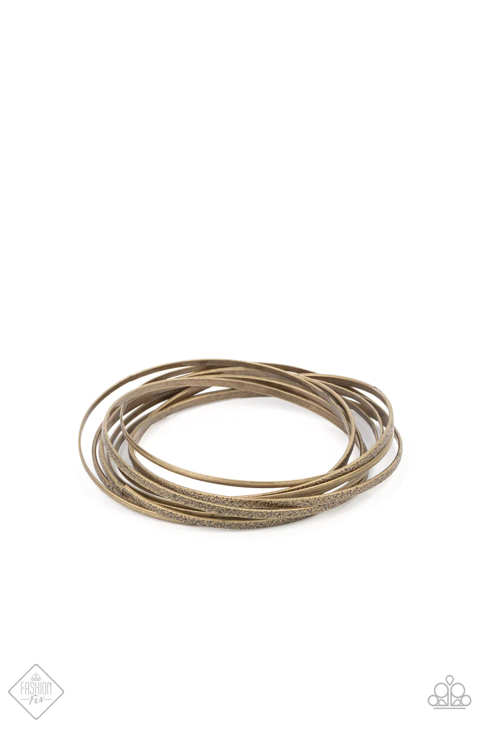 A collection of rustic textured and antiqued brass bangles create a tinkling chime as they mingle in a rhythmic fashion around the wrist.