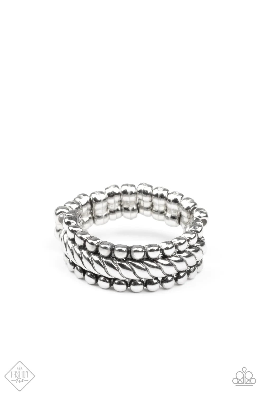 A twisted silver band is flanked by rows of antiqued silver studs, creating a rustically layered look across the finger. Features a dainty stretchy band for a flexible fit.