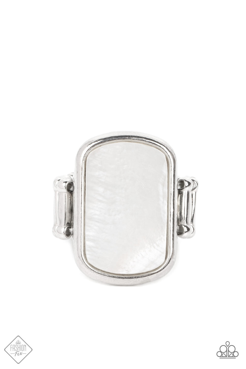 An oversized rectangular white pearlescent shell is encased in a simple silver frame resulting in a refreshingly tranquil centerpiece atop the finger. Features a stretchy band for a flexible fit.