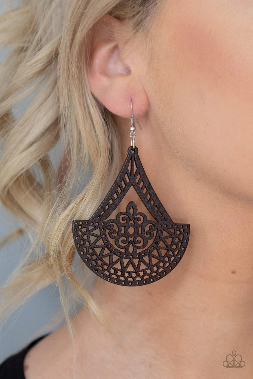 Stenciled in an airy wooden filigree pattern, a decorative frame swings from the ear for a seasonal look. Earring attaches to a standard fishhook fitting.