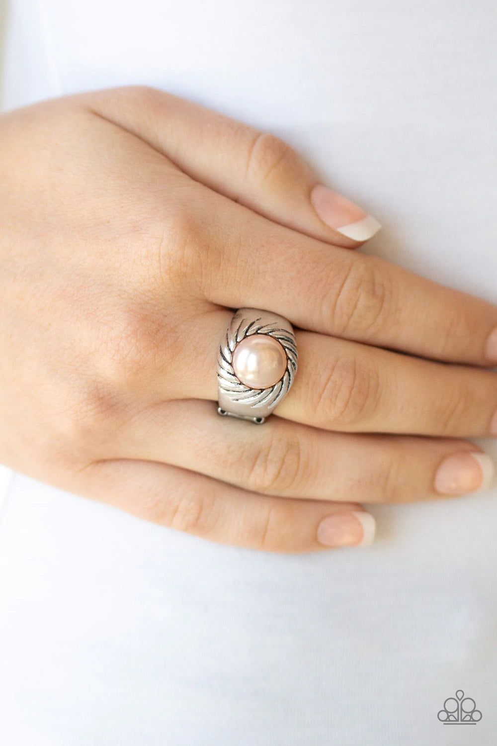 A pearly brown bead is pressed into the center of a thick silver band whirling with linear details for a refined flair. Features a stretchy band for a flexible fit.