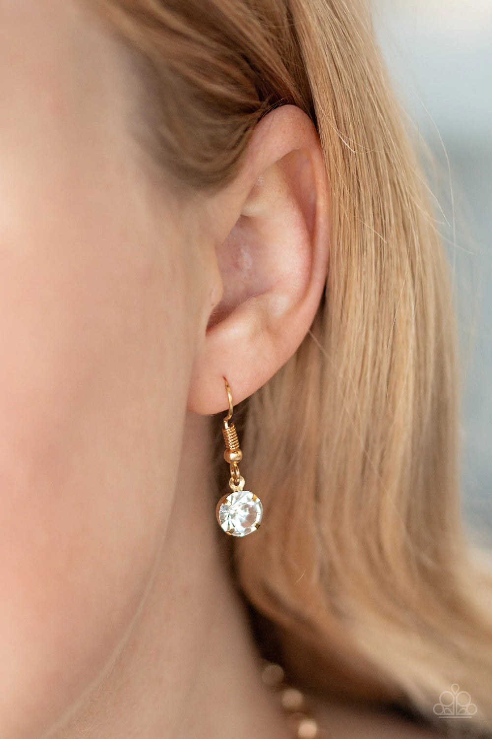 Classic gold beads and oversized white rhinestones trickle from the bottom of interlocking gold chains, creating a fierce fringe below the collar. Features an adjustable clasp closure.