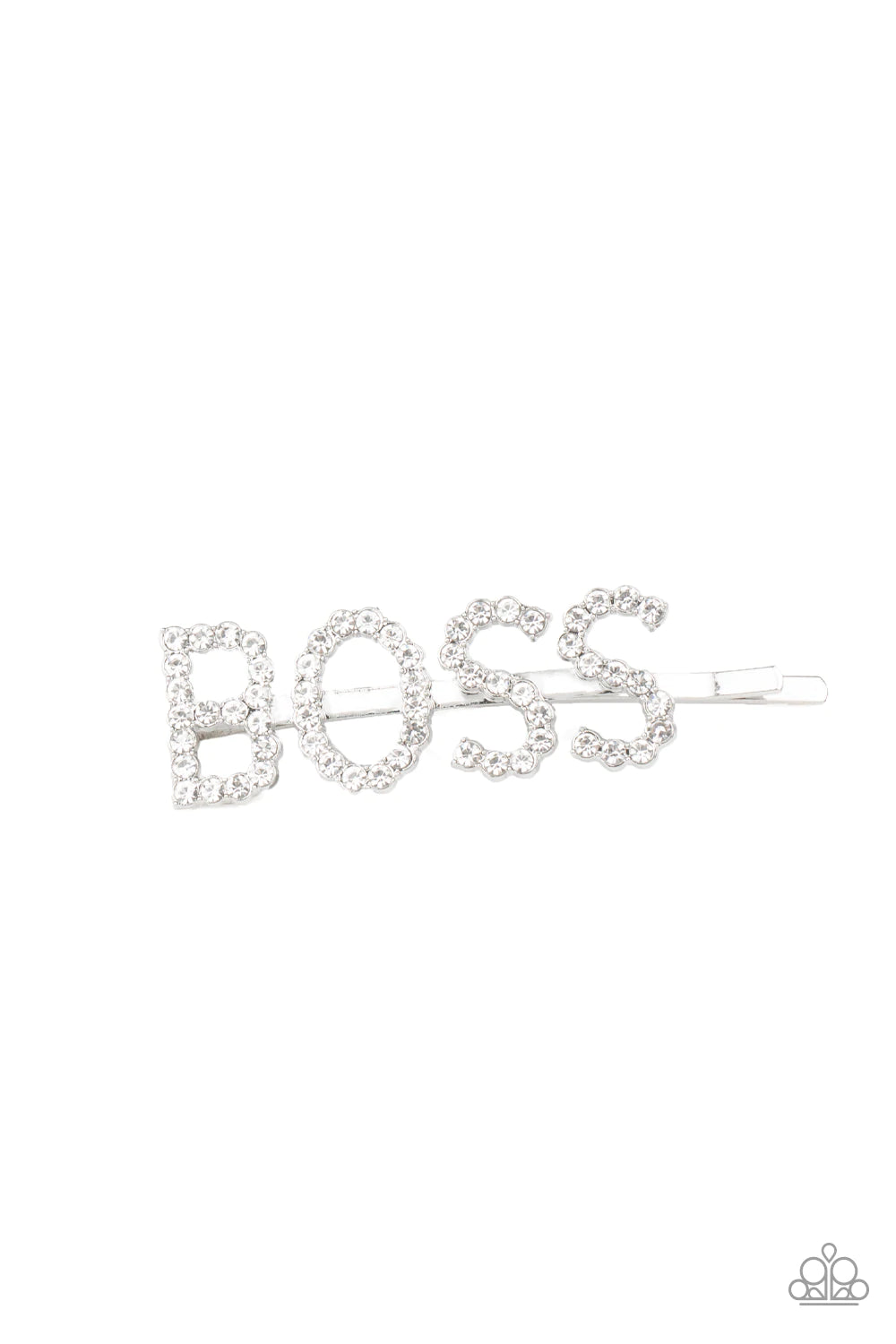 Encrusted in glassy white rhinestones, glistening silver letters spell out the word, "BOSS," across the front of a silver bobby pin for a glamorous look.